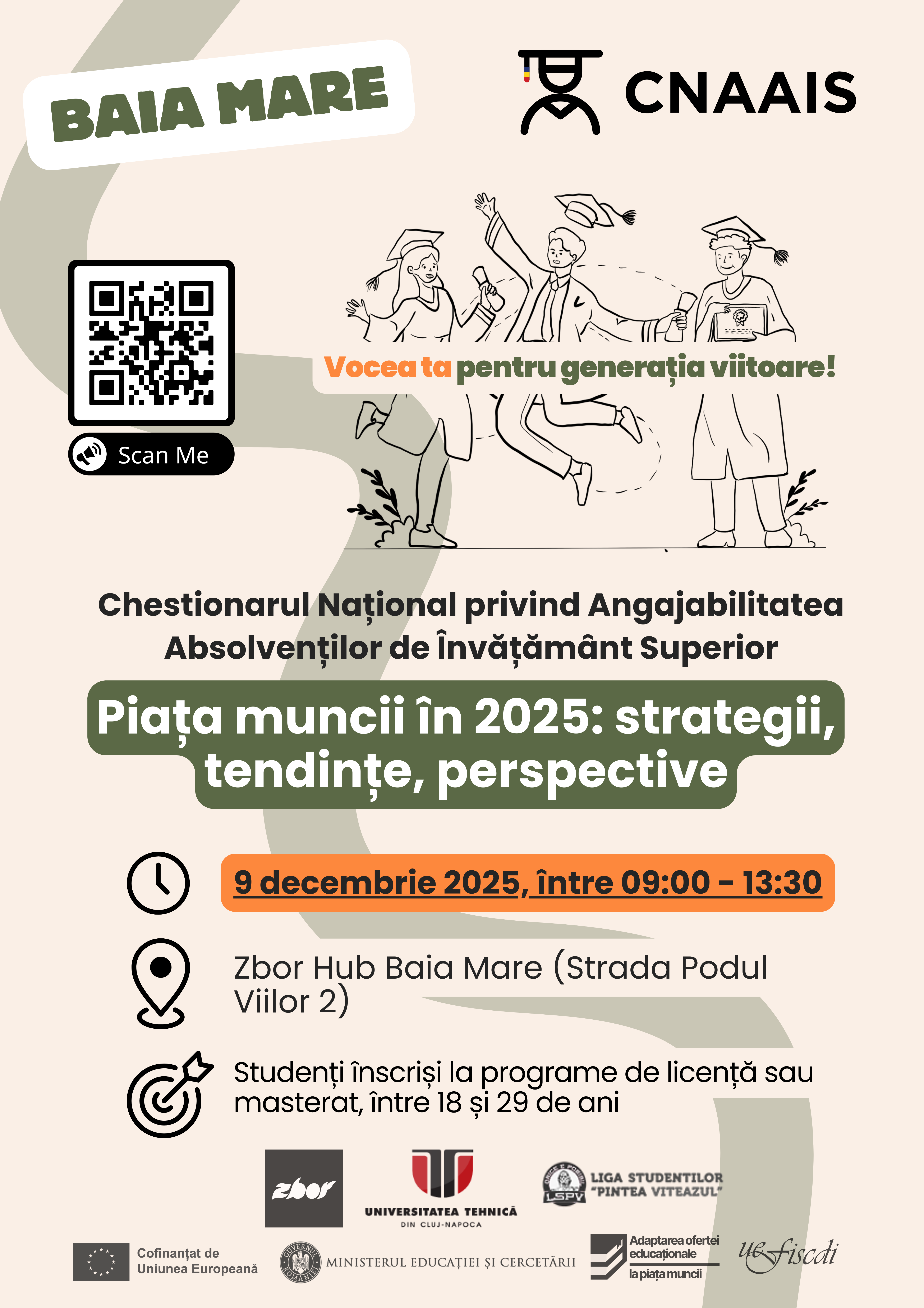 📌 Chestionarul Național privind Angajabilitatea Absolvenților de Învățământ Superior (CNAAIS): „Piața muncii în 2025. Strategii, tendințe, perspective” ajunge la Baia Mare!